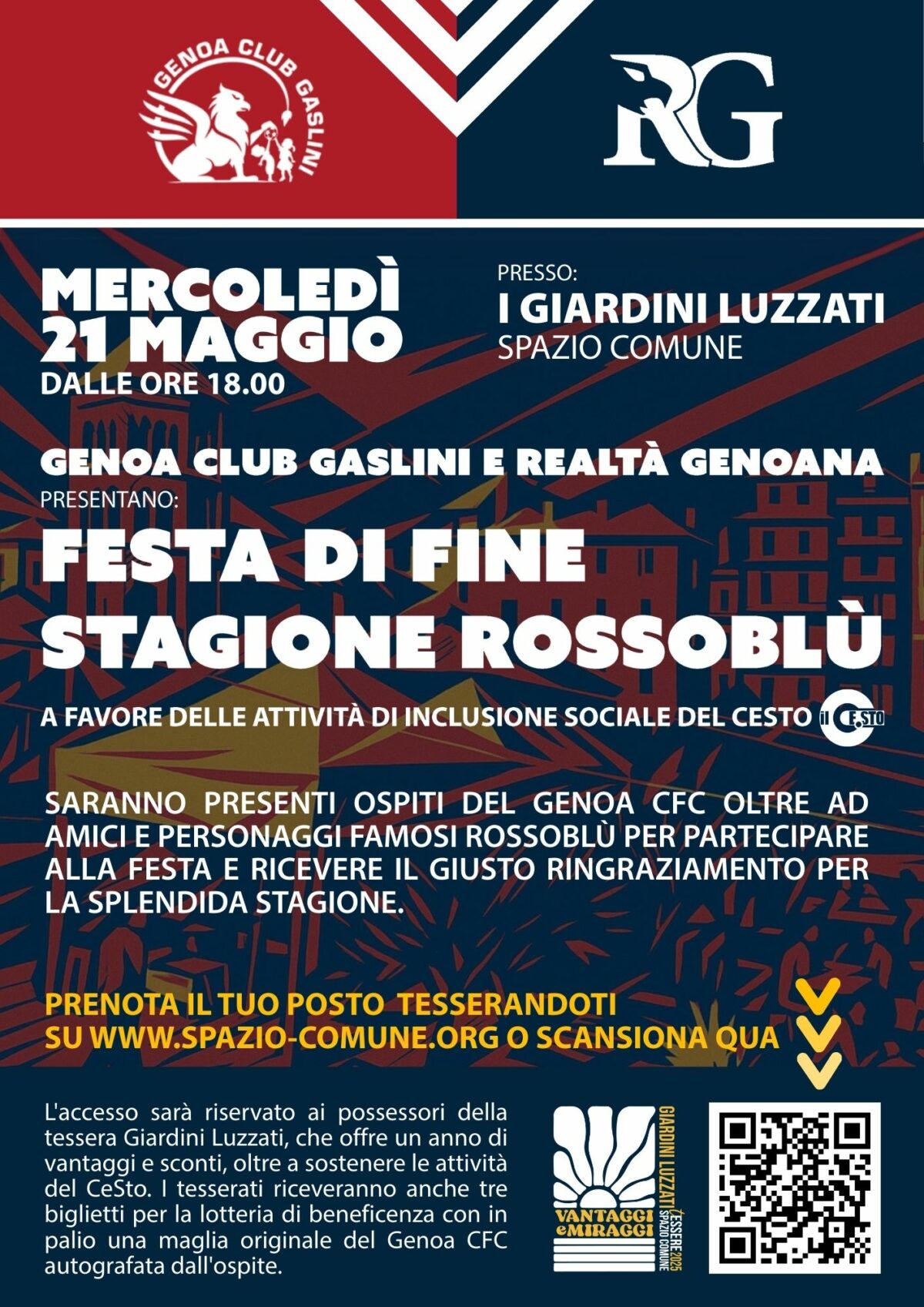 Unisciti al Genoa Club Gaslini e a Realtà Genoana per celebrare insieme una stagione indimenticabile! Ospiti speciali, personaggi famosi rossoblù e tante sorprese ti aspettano per una serata di festa e passione rossoblù.