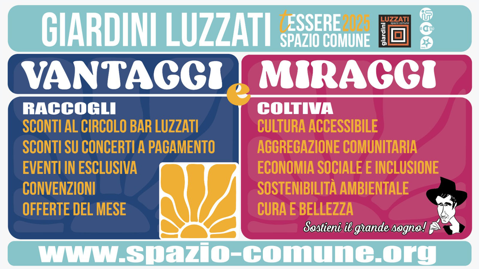T-ESSERE Spazio Comune significa essere parte attiva del progetto dei Giardini Luzzati, tessere relazioni e cambiamento, sostenere cultura e socialità, con un piccolo contributo di:
